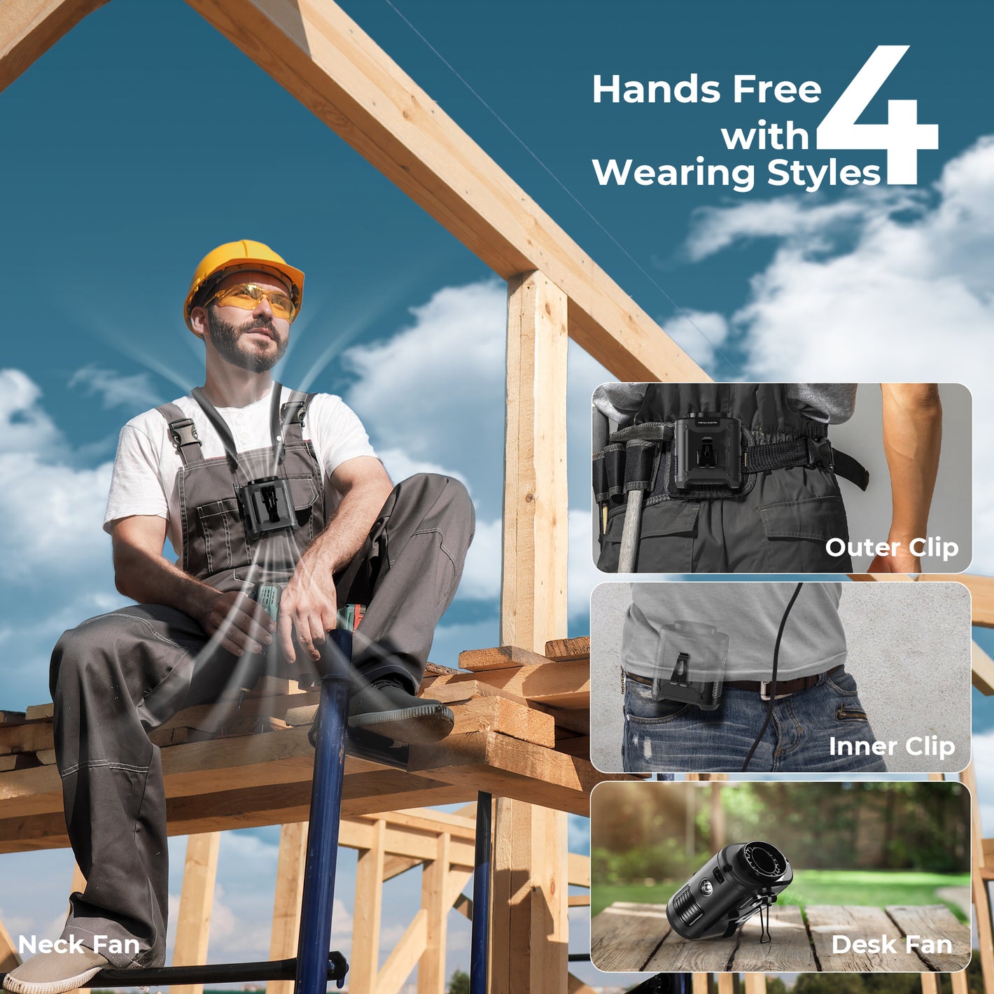 - Hands-Free Design: Wear it as a belt fan, neck fan, or use it with the stand for desk use. Includes outer and inner clips and a lanyard for versatile use.