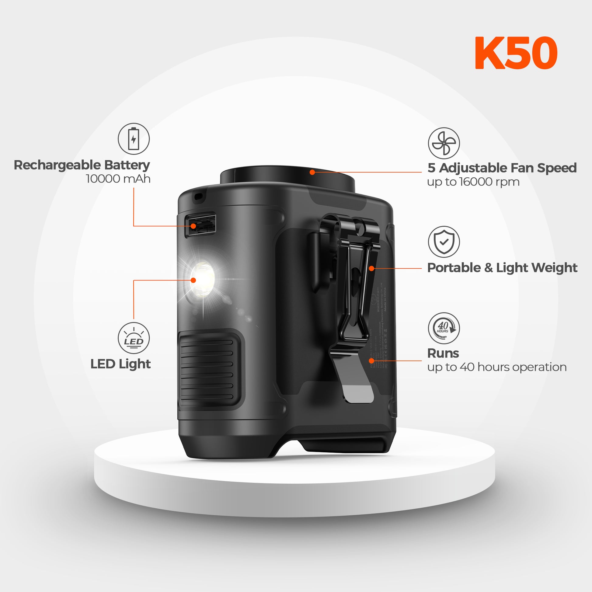 Stay cool and comfortable with the PANERGY K50 Rechargeable Portable Waist Fan. With a powerful 10000 mAh battery for up to 40 hours of use, 5 adjustable speeds up to 16000 rpm, and a built-in LED light with SOS signal, this lightweight fan is perfect for all-day refreshment.