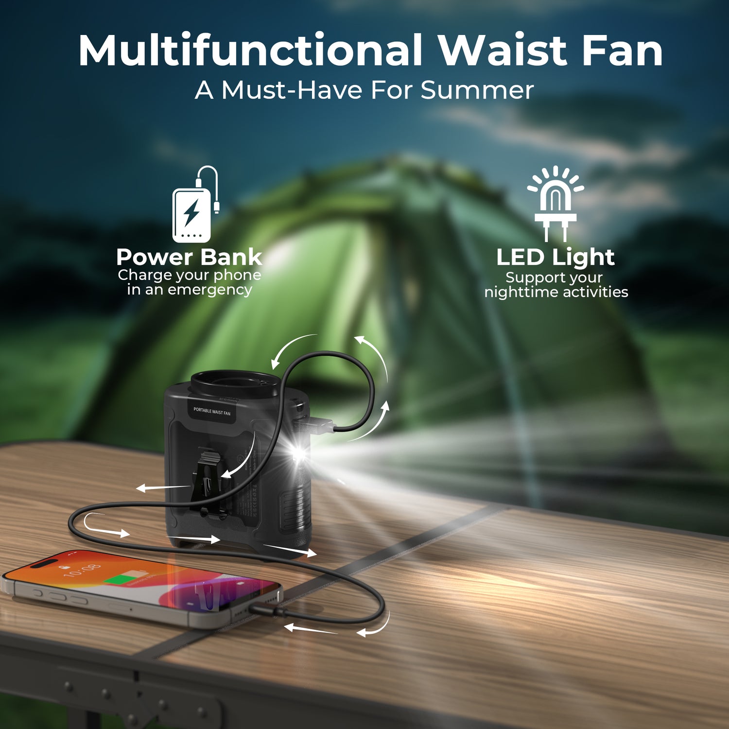 Stay cool and comfortable with the PANERGY K50 Rechargeable Portable Waist Fan. With a powerful 10000 mAh battery for up to 40 hours of use, 5 adjustable speeds up to 16000 rpm, and a built-in LED light with SOS signal, this lightweight fan is perfect for all-day refreshment.